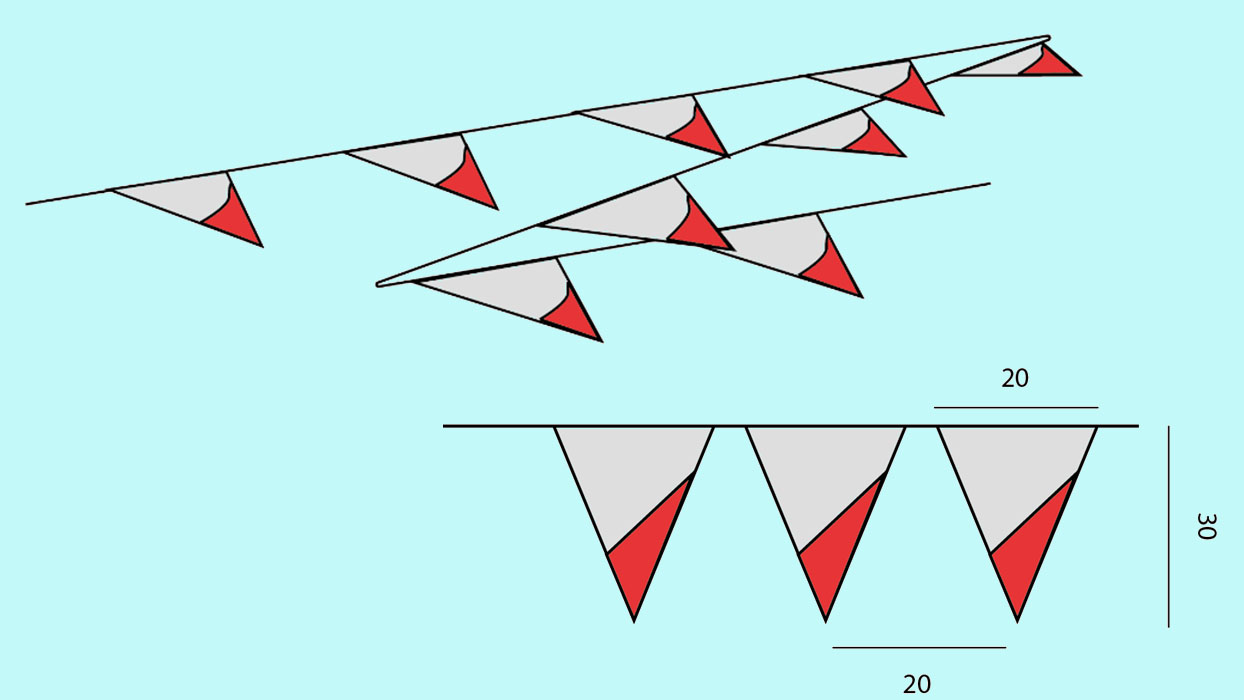 • Bandierine con taglio al vivo e cucite su nastro in poliestere, distanza tra una bandierina e l’altra cm 20