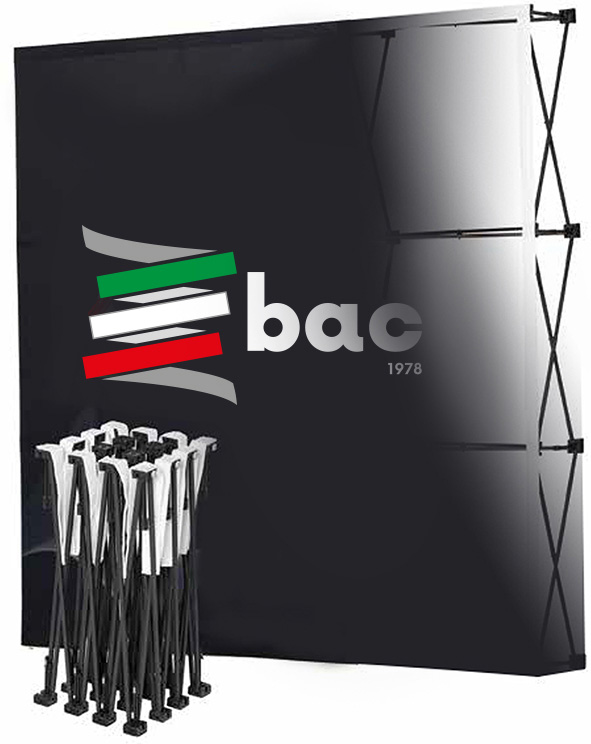 Fondale pop-up per interviste, realizzato con struttura modulare in alluminio, leggera, componibile e facilmente smontabile. Il rivestimento è in tessuto oscurante stampato in digitale ad alta qualità, completamente personalizzabile con grafiche e loghi. Il sistema di fissaggio con velcro garantisce un allestimento rapido e pratico, ideale per eventi, conferenze e riprese video.